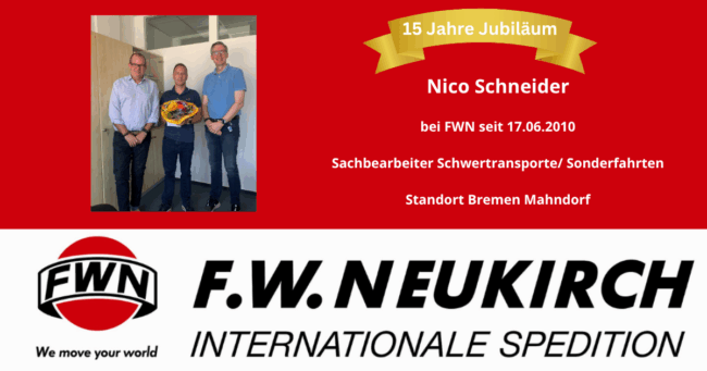 “Ehrentag“ Die dritte Jubilar Nico Schneider (Sachbearbeiter Schwertransporte/ Sonderfahren) am Standort in Bremen Mahndorf) konnte am 17.06.25 auf 15 Jahre Betriebszugehörigkeit bei FWN zurückblicken. Der Geschäftsführer Martin Schlömp (links) und der Abteilungsleiter Marc Röpke (rechts) gratulierten im Namen des gesamten Teams. Applaus, Applaus- was für eine großartige Leistung. Es gab an seinem Ehrentag Glückwünsche und…