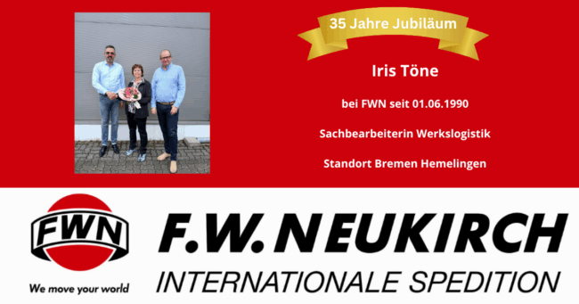 “Festtag“ Auch im Juni wird weiter gefeiert. Wir haben 3 Jubilare, die gemeinsam auf 65 Jahre Betriebszugehörigkeit zurück blicken. Die erste Jubilarin war Iris Töne (Sachbearbeiterin Werkslogistik in Bremen Hemelingen)- sie feierte am 01.06.25 ihre 35-jährige Betriebszugehörigkeit bei FWN. Vom Geschäftsführer Martin Schlömp (rechts) und vom Bereichsleiter Dennis Hohmann (links) gab es Gratulationen und Glückwünsche…
