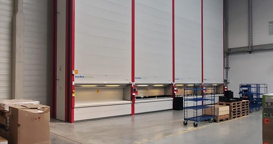 Wir sind umgezogen- mit dem Kardexsystem, einer Paternosteranlage. Ein Paternosterregal ist auch bekannt als Umlauflagersystem oder vertikales Karusselllager. Es basiert auf dem Prinzip eines Paternosteraufzugs, bei dem vertikal angeordnete Regalböden umlaufen und Waren direkt zum Bediener geliefert werden. Man bezeichnet es auch als „Ware-zum-Mann-Prinzip“. Es ist somit ein effizientes und flexibles Lagersystem, das sich optimal für die Lagerung von Kleinteilen eignet.