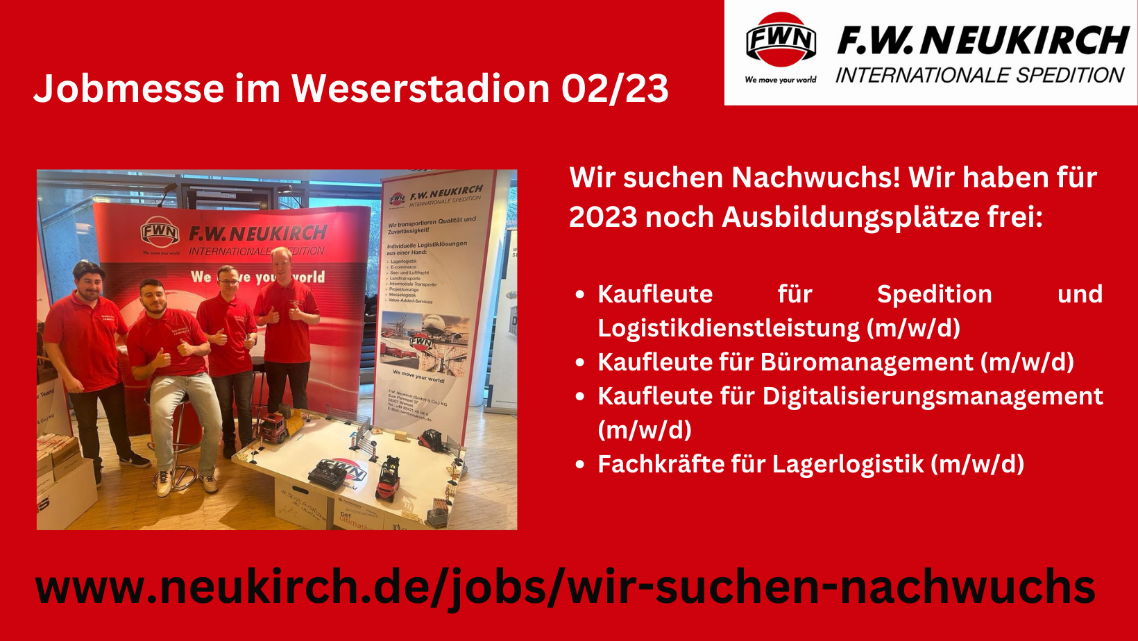 Logistik zum Anfassen. Natürlich war FWN auch in diesem Jahr wieder auf der Jugendmesse Job4u im Bremer Weserstadion dabei. Am 17./18.02.23 drehte sich wieder alles um Chancen und Perspektiven in Sachen Ausbildung und Studium.